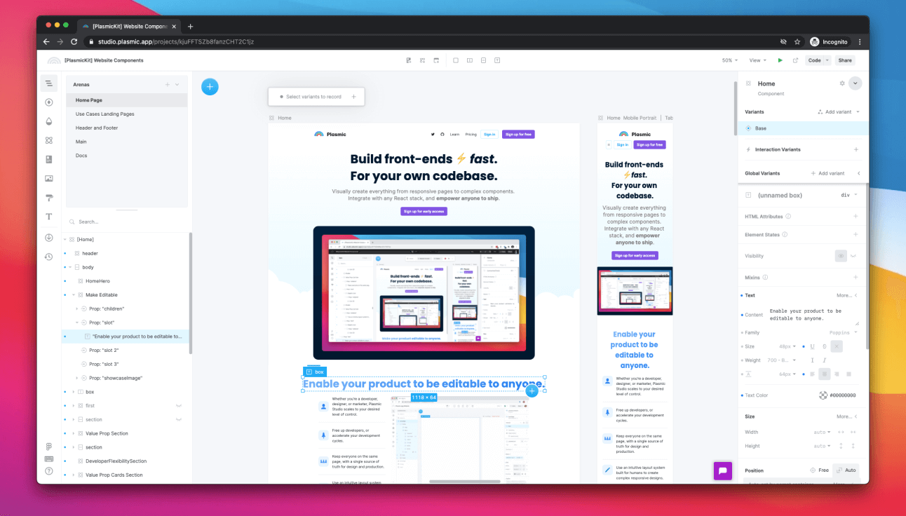 Build visual content and pages, seamlessly integrated with your codebase. Plasmic is used by some of the world's largest sites to unblock their teams, eliminate development cycles, and ship incredibly fast.
